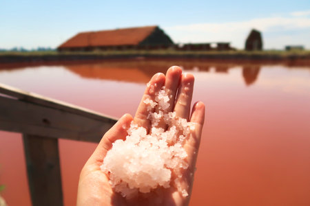 Handful of salt in front of the main bathing, swimming pool with intense pink color at the Burgas Salt Pans, Lake Atanasovsko, Atanasovo, Burgas, Bourgas, Bulgaria 2022