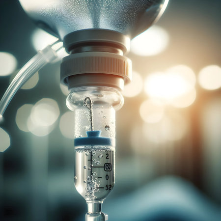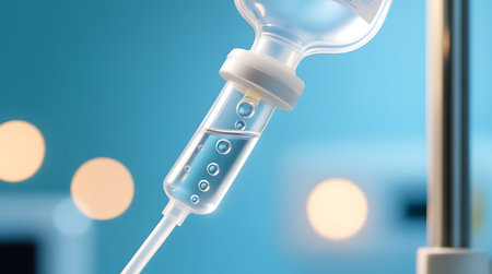 A close-up of a medical IV drip in a softly lit room, with sunlight streaming through curtains, creating a tranquil atmosphere ideal for healing and patient care.