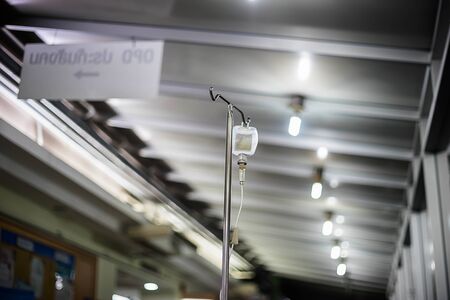 Hospital surgery medical drip in emergency room operating theater ward in medical clinic. Saline solution drip for patient in hospital.