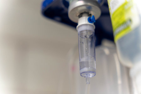 Intravenous therapy delivering saline solution through drip chamber in hospital setting
