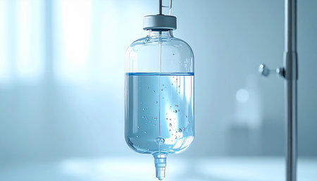 An IV bag containing a transparent liquid is suspended in a clinical environment, creating a calming ambiance with soft light reflections.