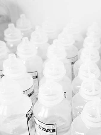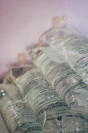 Close up of bottle saline solution and treatment in a hospital