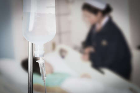 Close up medical intravenous IV drip in hospital background
