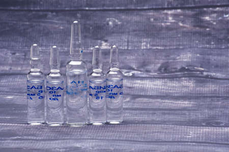 Glass medical ampoule vial for injection. Medicine is dry white drug penicillin powder or liquid with of aqueous solution in ampulla. Close up. Bottles ampule with aluminum cap on backgrounds gray.