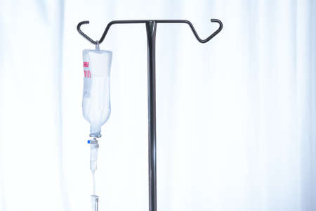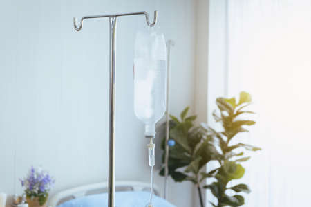 Close up saline IV drip Infusion bottle with IV solution for patient in ward hospital.