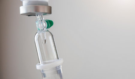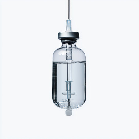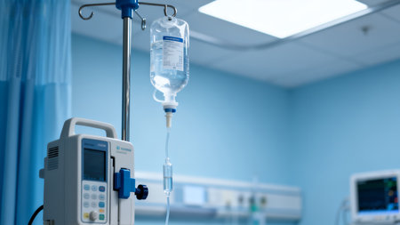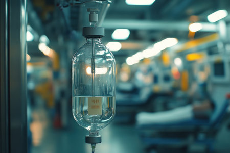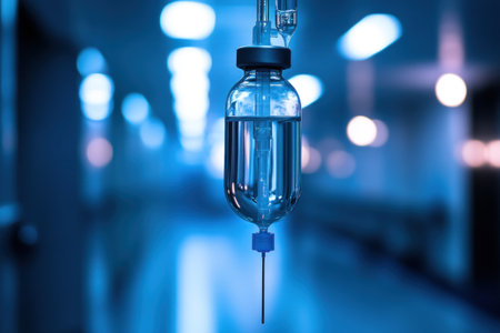 In the quiet, sterile environment of a hospital room, an intravenous drip delivers life-sustaining fluid. The soft, cool light reflects off the glass, symbolizing hope, modern medicine, and the steady process of healing and recovery.