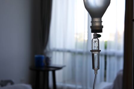 Close up of saline IV drip in hospital room. Healthcare and medical concept.