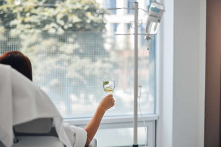 Back view of a patient sitting in a cosmetic chair during the intravenous vitamin therapy