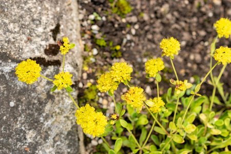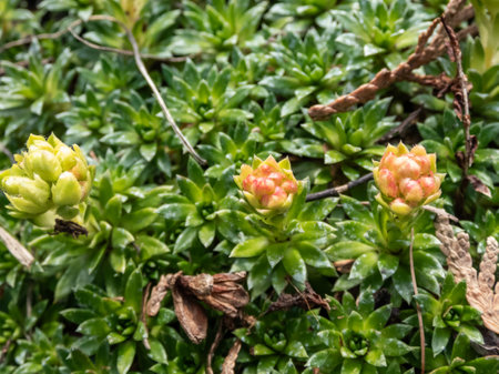Close-up of yellow flower buds of the Saxifrage (Saxifraga sp.) growing in rock garden in bright sunlight