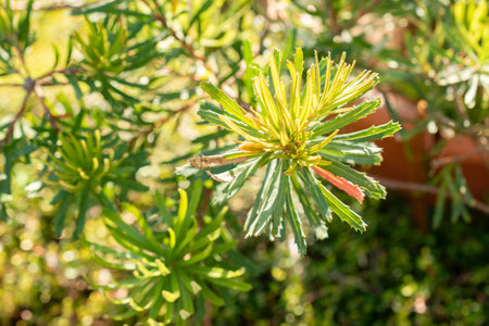 Cone bush (Leucadendron salignum) close up in the garden Beautiful shrub with foliage which turns yellow in Winter and bright red centre in Spring