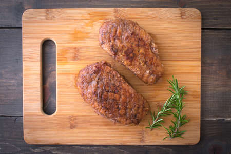 Luxury food. Plate with Fried or griled meat steak. Juicy veal Medallion with rosemary in tomato sauce. Top view. Vertical format. Soft focus. Close-up shot.