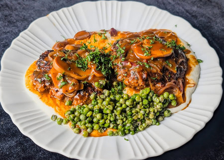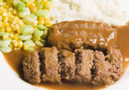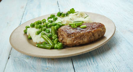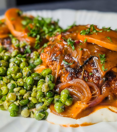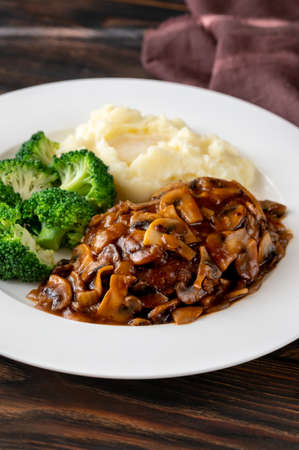 Salisbury steak topped with mushroom and onion gravy served over creamy mashed potatoes with green peas and chopped parsley.