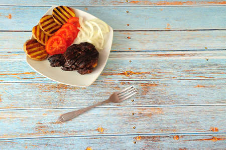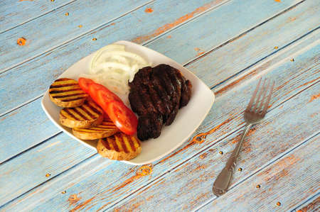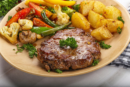 Grilled beef stein with potatoes, tomatoes and onions, on a wooden table. Close-up.