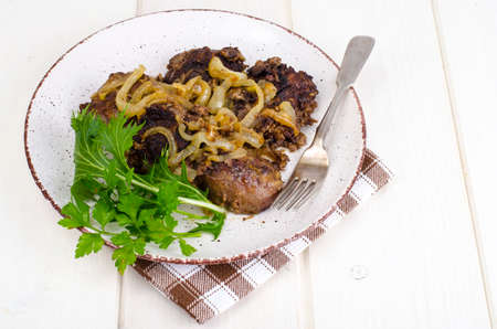 Fried chicken liver in batter on plate with greens. Studio Photo