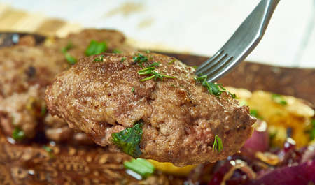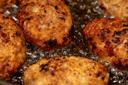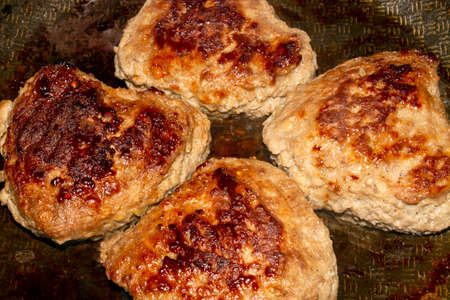 Fried minced cutlets served in a pile on a plate, typical eastern european homemade food, tasty dish