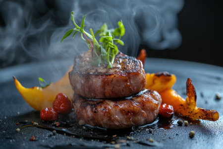Steaming, perfectly cooked meat with roasted peppers and herbs on a black plate.