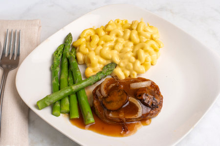 salisbury steak top with onions and mushrooms served with asparagus and macaroni and cheese
