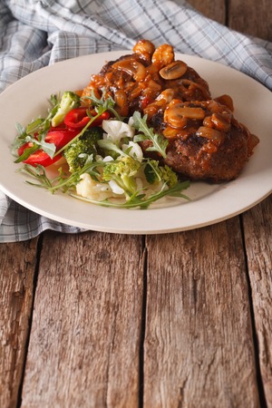 Salisbury steak with vegetable salad on a plate on the table. vertical