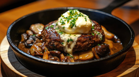 Cast iron skillet filled with juicy Hamburg steak, topped with a dollop of melting butter and a side of sauted mushrooms