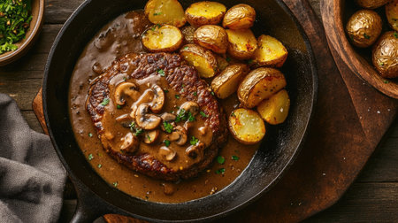 Hamburg steak served in a hot cast iron skillet, covered in thick mushroom gravy, paired with crispy roasted potatoes