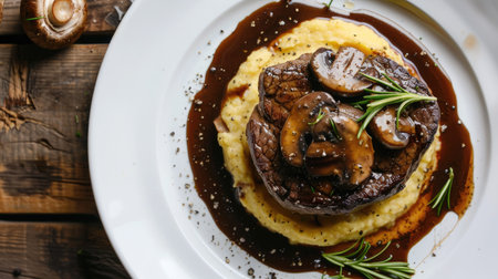 Top view of a beef steak topped with a rich mushroom sauce, served with a side of creamy polenta. Ideal for indulgent and gourmet dining visuals.