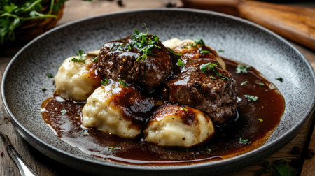 Boiled beef with soft dumplings, served with a drizzle of rich sauce and garnished with fresh herbs on a rustic plate.