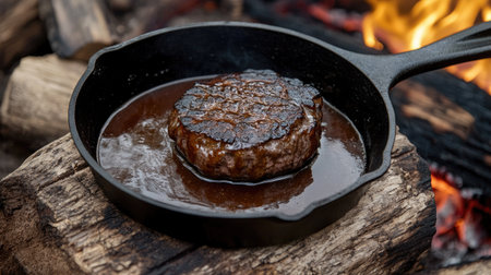 Cast-iron skillet Hamburg steak with thick demi-glace sauce, resting on a wooden log near a campfire, rustic outdoor setting