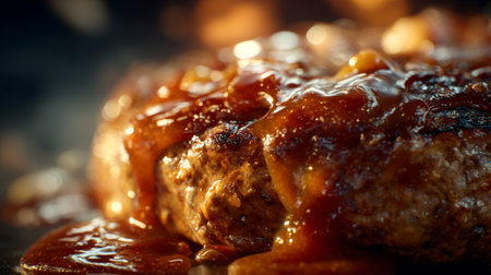 Close-up of a juicy hamburger patty grilling, covered in melted cheese and barbecue sauce, with a blurred fire in the background