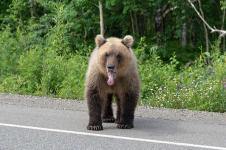Hungry Kamchatka brown bear put his tongue out of his mouth, stands on asphalt road. Eurasia, Russian Far East, Kamchatka Peninsula.