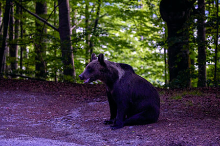 Brown bear is a wild and dangerous animal, rest after a walk, bears of Synevyr glade in the Carpathians, early spring in the national park.