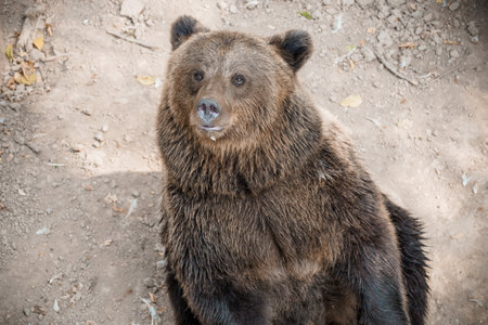 Brown bear sitting in a zoo. Brown bear in a funny pose.