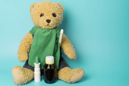 Cute toy bear holding a thermometer with nasal spray and cough syrup. Seasonal cold and flu concept.