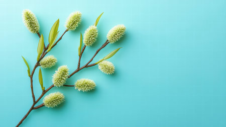 blooming willow tree on light grey background with copy space, spring Easter concept