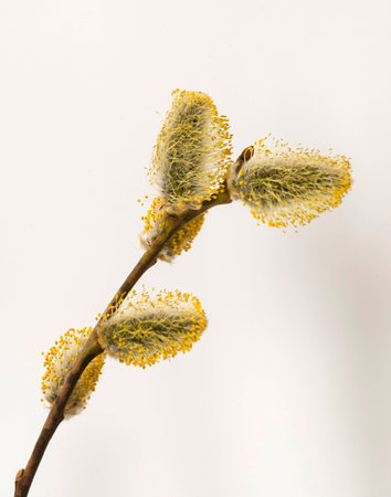 pussy willow catkins with yellow pollen inside, background blurred to white
