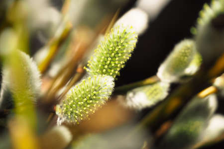 Delicate branches on which the blossoms are blooming willow in early spring illuminated by the light.