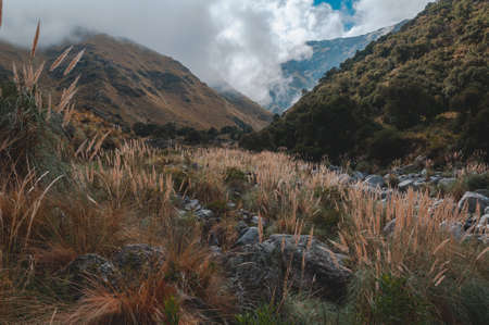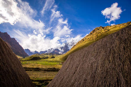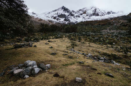 surroundings of the base camp of the alpamayo mountain in the quebrada santa cruz in peru, with snowy mountains in the background