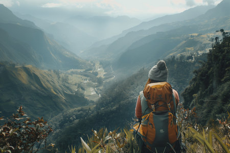 Adventurous hiker with backpack gazing at the breathtaking view of a foggy mountain valley