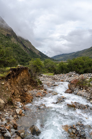 A rushing mountain river cuts through the rugged landscape of the Humantay Lake trek in Peru. Surrounded by green hills and misty peaks, the scene captures the raw beauty of the Andean wilderness