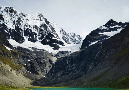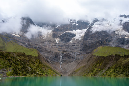 Laguna Humantay, a breathtaking turquoise glacial lake, sits beneath towering Andean peaks partially covered in mist. Waterfalls cascade from melting glaciers, creating a stunning natural landscape in Peru’s high-altitude wilderness