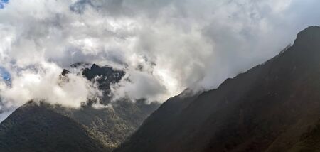 A mountain in the background almost hidden by the clouds and fog in the wild Andes along the Inca Trail. Peru. South America. No people.