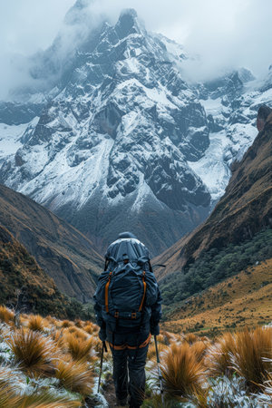 Majestic snow-covered peaks emerge through the mist on the Humantay Lake trek in Peru. The breathtaking Andean scenery highlights the rugged beauty of the high-altitude landscape