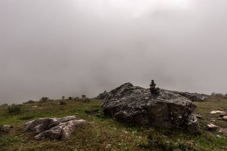A small pyramid stands on a large boulder in the mountains with dense fog in the background. Gloomy weather. Horizontal.