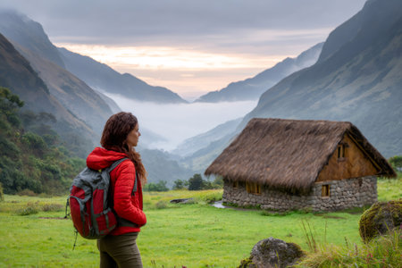 Female hiker admiring the sunrise over the Andes mountains, near a traditional hut with thatched roof