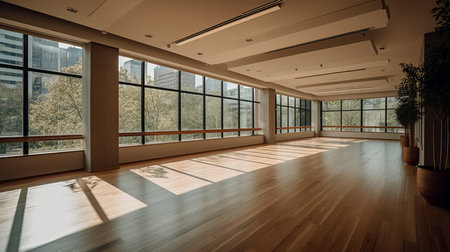 A refreshing yoga studio with bamboo flooring and floor-to-ceiling windows. A.I.