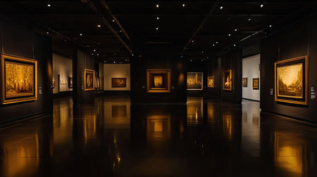 A captivating modern art gallery featuring elegantly framed paintings against dark walls, showcasing a serene atmosphere with rich reflections on the floor.