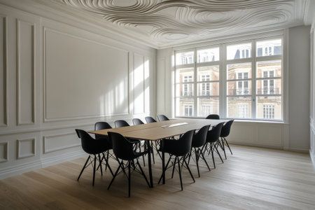 White walls, wooden floor, and a ceiling with decorative wood strips in the conference room. A long table for ten people with black chairs around it, and a window overlooking the buildings outside. A modern interior design of a business office space or meeting area. High-resolution, hyper-realistic photograph. --ar 3:2 --v 6.1 Job ID: d4905238-8010-497a-bbd3-77d84e75d7aa