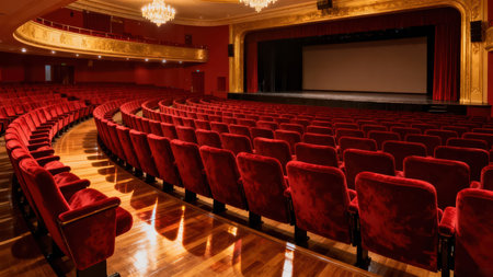 Experience the inviting atmosphere of a modern cinema interior featuring empty rows of plush seating, soft lighting, and a cozy setting perfect for enjoying films.