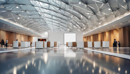 Attendees engage in a major political conference in a modern hall with sleek designs and high-tech screens showcasing key information.