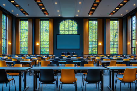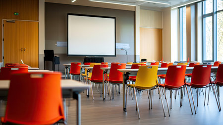 Rows of empty chairs facing a large screen in a seminar hall, natural lighting and minimalist design