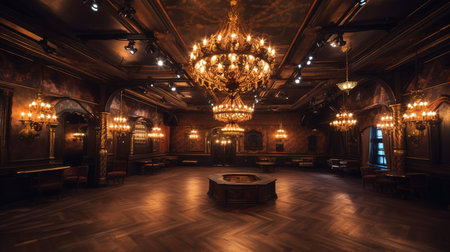 Empty ballroom interior with golden chandeliers illuminating dark wood floor and walls, creating a luxurious and vintage atmosphere. Ai generative